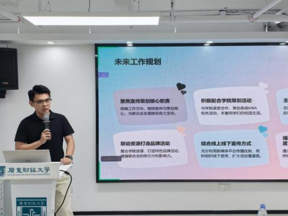第十三届MBA联合会主席成员刘慧代表上一届主席团作工作报告。报告全面回顾了过去一年联合会在深化校企合作、整合校友资源、塑造品牌活动、服务学员成长等方面取得的显著成果,为新一届联合会的工作奠定了坚实基础。