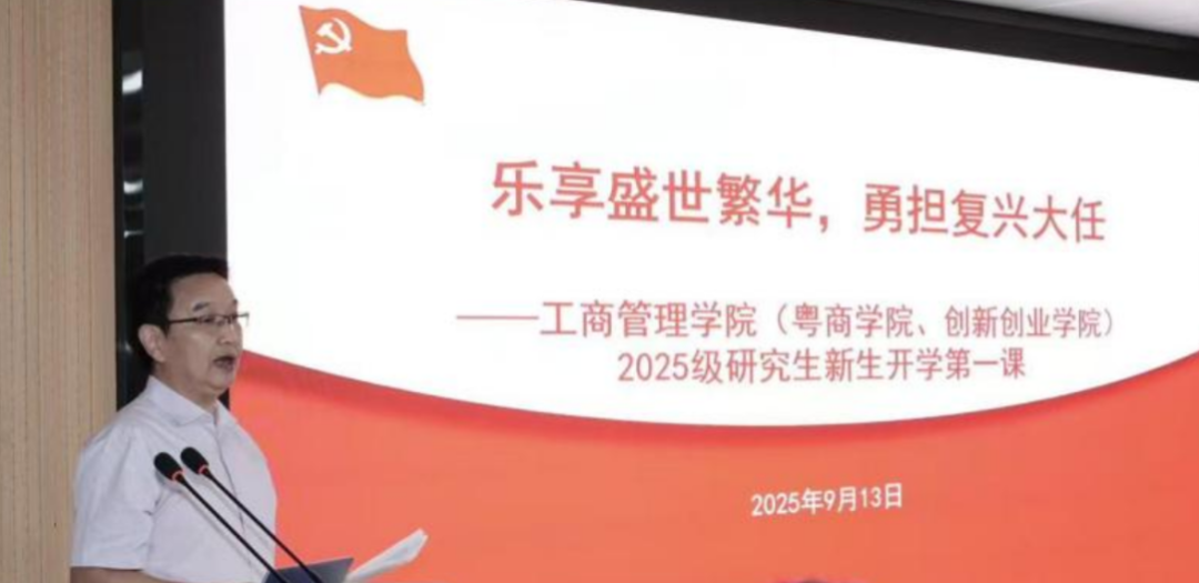 随后,王德斌开讲“思政第一课” —《乐享盛世繁华,勇担复兴大任》,为同学们筑牢思想根基。王德斌表示,作为一名研究生,既要坚定拥护党的领导,团结一心,勇担复兴大任,又要坚持开拓创新,深刻认识到人才是引领发展的第一生产力,要不断精进自己的技能,提升自我创新能力。他还强调了三观不是“装饰品”,广财学子必须要摆正三观才能行稳致远。最后他勉励新生珍惜同窗情谊、强化学术钻研、积极投身实践,为未来发展筑牢根基。
