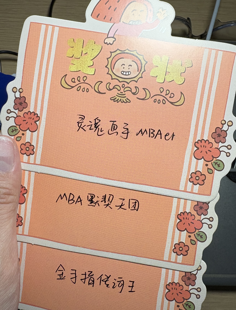 游戏结束后,项目组为表现突出的同学颁发了趣味奖状:“金手指传词王”“灵魂画手MBAer”“默契天团”“社交达人”……每一个称号背后,都是我们共同的欢笑与努力。